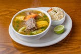Con yuca, platano madura, banano verde, repollo y elote. Beef soup with cassava, sweet plantain, banana, cabbage, and corn.